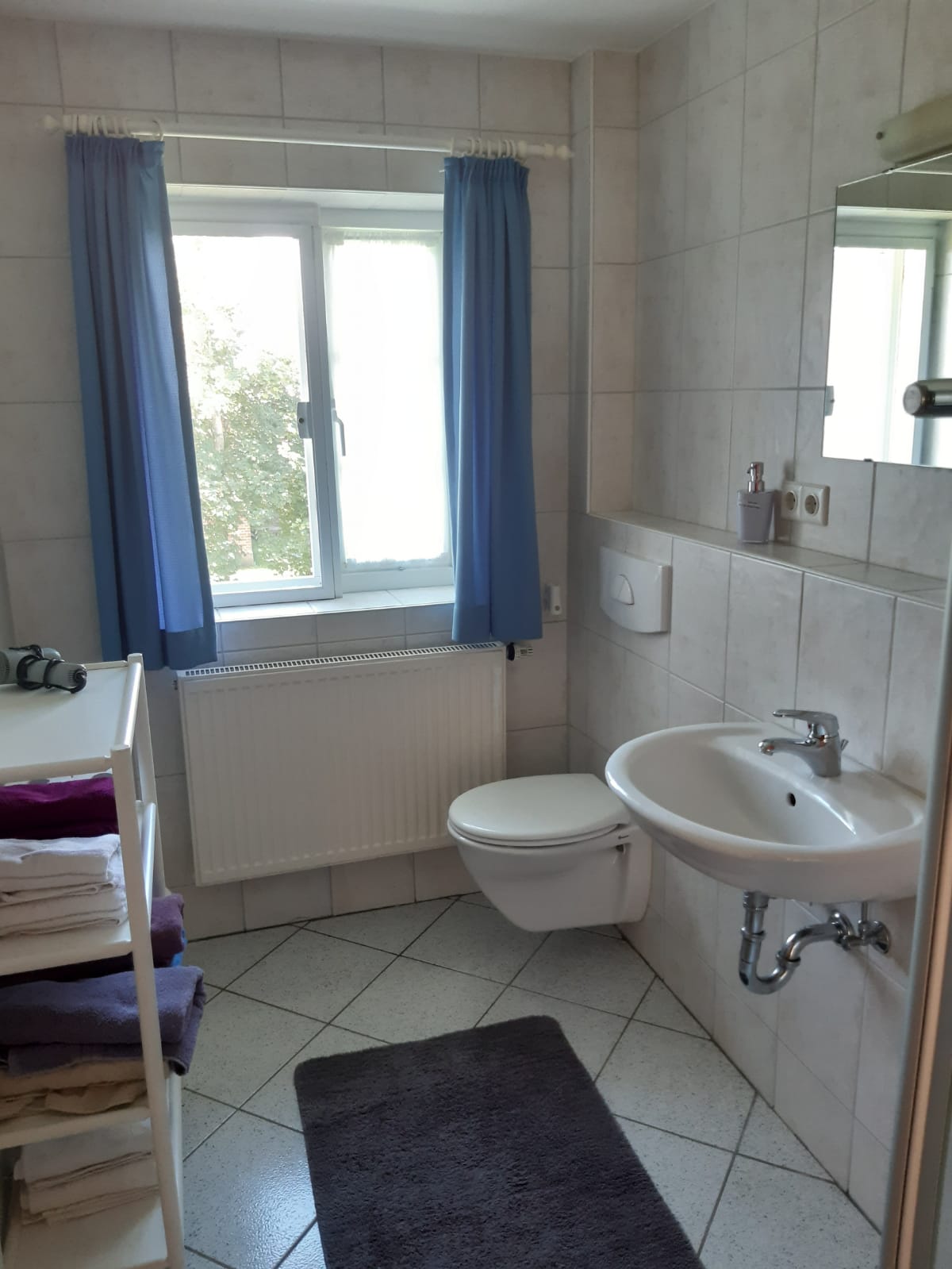 Duschbad: Badezimmer mit Fenster, Handtücher, Dusche und WC, Föhn